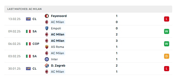 Phong độ gần đây AC Milan vs Feyenoord