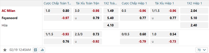 Bảng tỷ lệ kèo bóng đá AC Milan vs Feyenoord