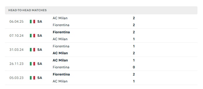 Lịch sử đối đầu AC Milan vs Fiorentina