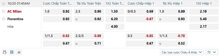 Soi kèo châu Á, kèo AC Milan vs Fiorentina
