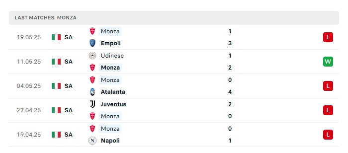 • Phong độ gần đây Monza