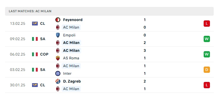 - Phong độ gần đây AC Milan