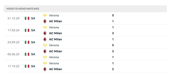 Lịch sử đối đầu AC Milan vs Verona