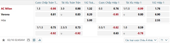 Bảng tỷ lệ kèo bóng đá AC Milan vs Verona