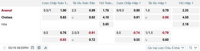 Bảng tỷ lệ kèo bóng đá Arsenal vs Chelsea