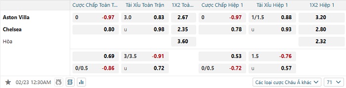Bảng tỷ lệ kèo bóng đá Aston Villa vs Chelsea