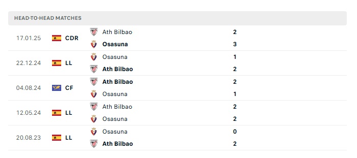 Lịch sử đối đầu Athletic Bilbao vs Osasuna