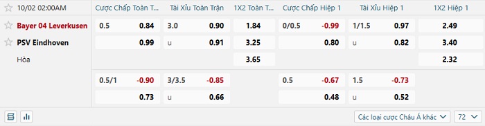 Bảng tỷ lệ kèo bóng đá B.Leverkusen vs PSV Eindhoven