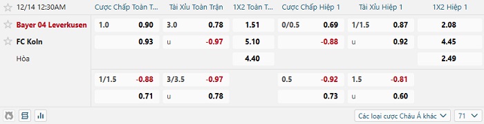 Bảng tỷ lệ kèo bóng đá Bayer Leverkusen vs FC Koln
