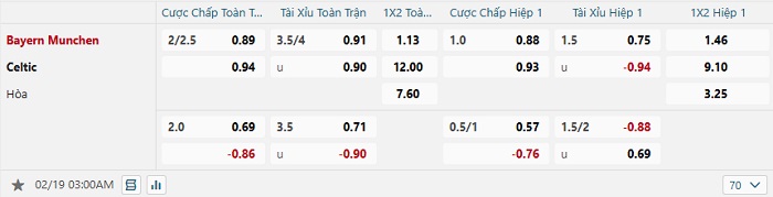 Bảng tỷ lệ kèo bóng đá Bayern Munich vs Celtic