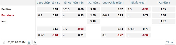 Bảng tỷ lệ kèo bóng đá Benfica vs Barcelona