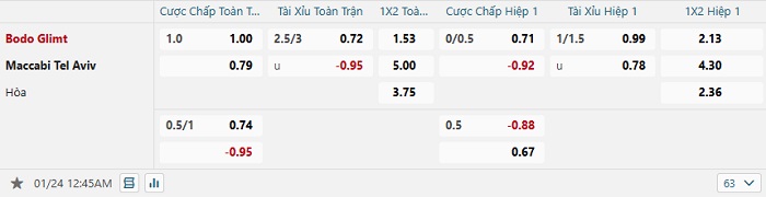 • Kèo tỷ số H1 Bodo Glimt vs Maccabi TA: 1-0
