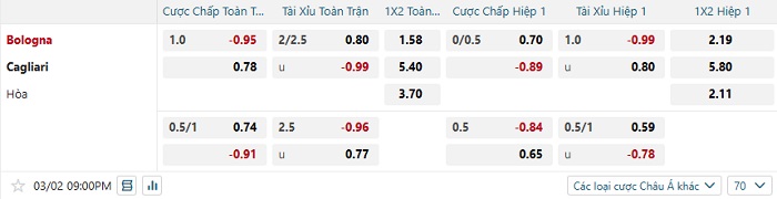 Bảng tỷ lệ kèo bóng đá Bologna vs Cagliari
