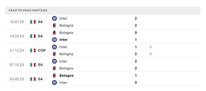Lịch sử đối đầu Bologna vs Inter Milan