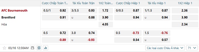 Bảng tỷ lệ kèo bóng đá Bournemouth vs Brentford