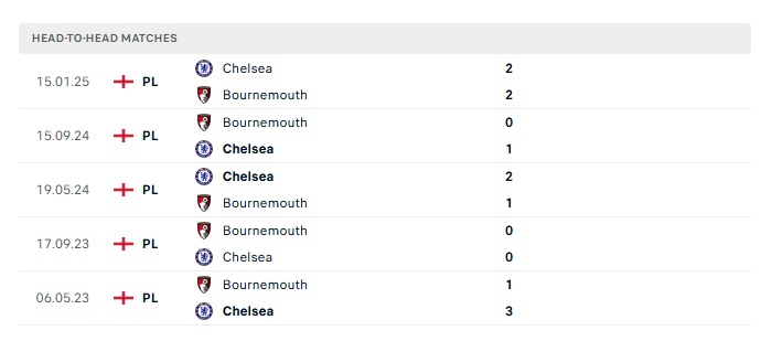 Lịch sử đối đầu Bournemouth vs Chelsea