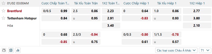 Bảng tỷ lệ kèo nhà cái Brentford vs Tottenham