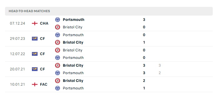 Lịch sử đối đầu Bristol City vs Portsmouth