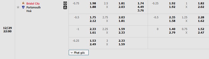 Bảng tỷ lệ kèo bóng đá Bristol City vs Portsmouth