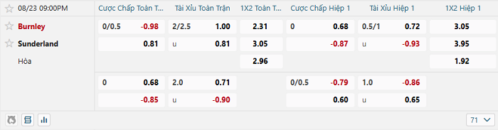 Bảng tỷ lệ kèo bóng đá Burnley vs Sunderland