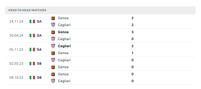 Lịch sử đối đầu Cagliari vs Genoa