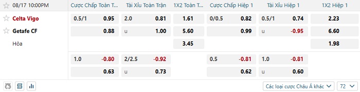 Hiện tại, nhà cái đưa ra cho Celta Vigo mức chấp -3/4 và họ hoàn toàn đủ khả năng thắng kèo trước đối thủ. Nên biết rằng trong 10 trận gần nhất của Getafe, họ chỉ có đúng 1 trận thắng kèo và còn lại toàn thua. Ngoài ra, cả 2 lần đụng độ nhau gần nhất của hai đội, Celta Vigo cũng toàn thắng kèo cả 2. Do đó, kèo châu Á trận đấu hôm nay sẽ khép lại với đội chủ nhà chính là lựa chọn an toàn nhất trong cả 2 hiệp.