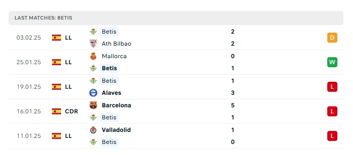 - Phong độ gần đây Real Betis