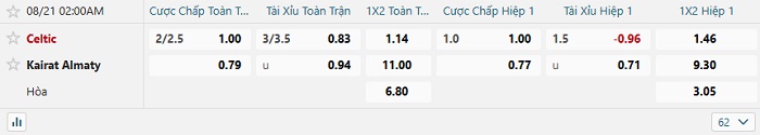 • Kèo tỷ số H1 Celtic vs Kairat Almaty: 2-0
