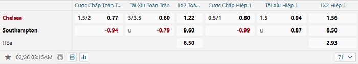 Bảng tỷ lệ kèo bóng đá Chelsea vs Southampton