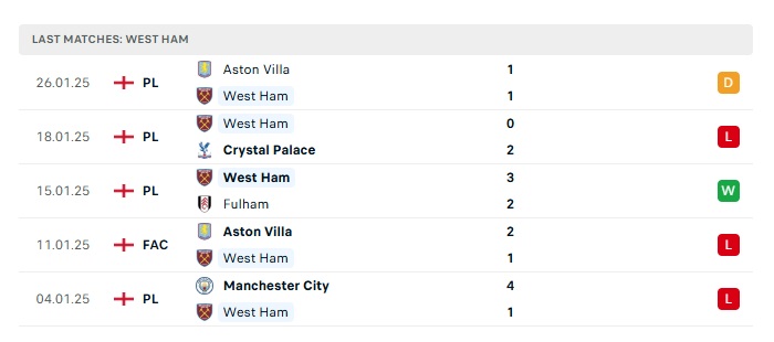 - Phong độ gần đây West Ham