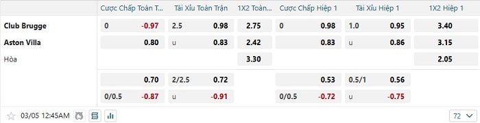 Bảng tỷ lệ kèo bóng đá Club Brugge vs Aston Villa
