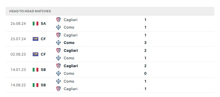 Lịch sử đối đầu Como vs Cagliari