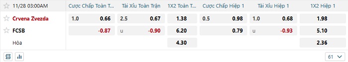 • Kèo tỷ số H1 Crvena Zvezda vs Steaua Bucuresti: 1-0