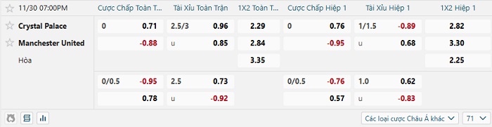 Bảng tỷ lệ kèo bóng đá Crystal Palace vs Man Utd