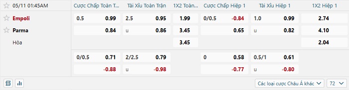 Bảng tỷ lệ kèo bóng đá hôm nay Empoli vs Parma