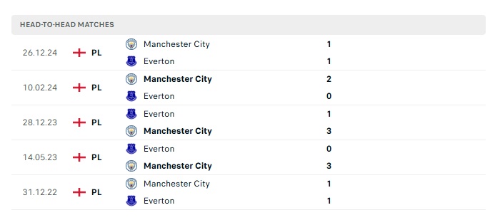 Phong độ gần đây Everton vs Man City
