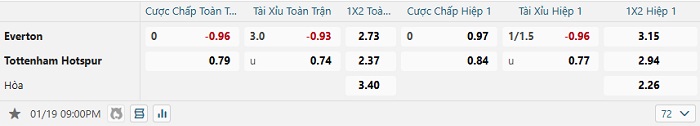 Bảng tỷ lệ kèo bóng đá Everton vs Tottenham