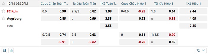 - Kèo tỷ số H1 FC Koln vs Augsburg: 1-0