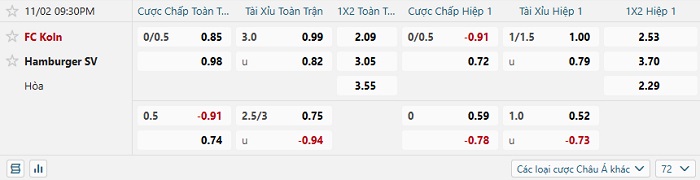 Bảng tỷ lệ kèo nhà cái FC Koln vs Hamburger