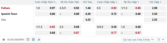 Bảng tỷ lệ kèo bóng đá Fulham vs Ipswich