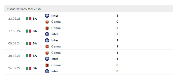 • Kèo tỷ số H2 Genoa vs Inter Milan: 0-2