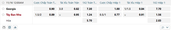 Bảng tỷ lệ kèo bóng đá Georgia vs Tây Ban Nha