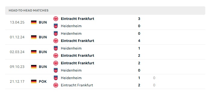 Phong độ gần đây Heidenheim vs Eintracht Frankfurt