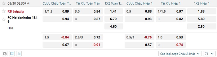Bảng tỷ lệ kèo bóng đá hôm nay Leipzig vs Heidenheim