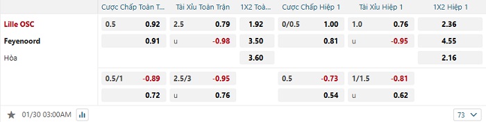 - Kèo tỷ số H1 Lille vs Feyenoord: 1-0