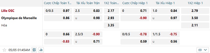 Bảng tỷ lệ kèo bóng đá Lille vs Marseille
