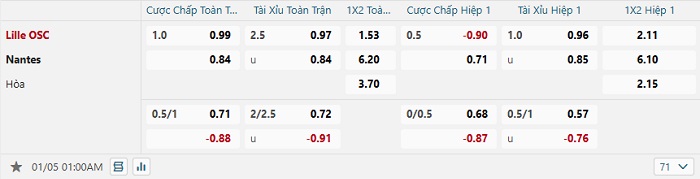 Bảng tỷ lệ kèo bóng đá Lille vs Nantes