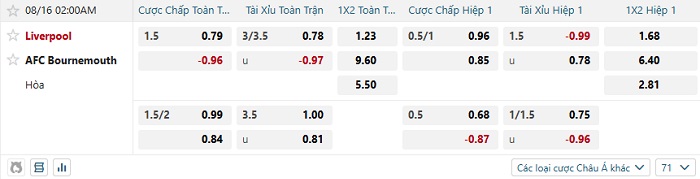 Bảng tỷ lệ kèo bóng đá Liverpool vs Bournemouth