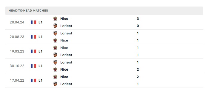 Lịch sử đối đầu Lorient vs Nice