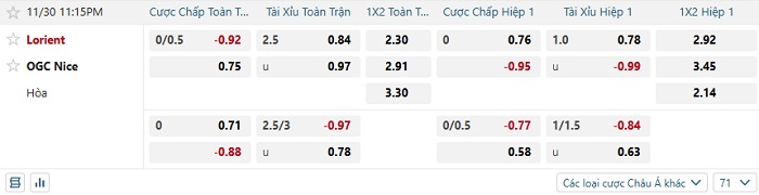 Soi kèo châu Á, kèo Lorient vs Nice